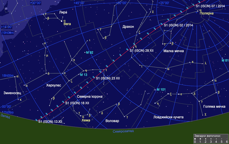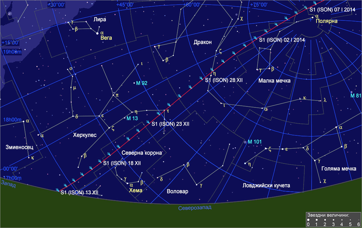 Карта на северозападната част на небето на 13 декември около 1h след залеза на Слънцето (в 17h 53m за София), с видимия път на кометата C/2012 S1 (ISON) от 13 декември до края на годината. Позициите на кометата са указани със символ за вечерта на всяка дата, а на всеки 5 денонощия са отбелязани името на кометата и дата.