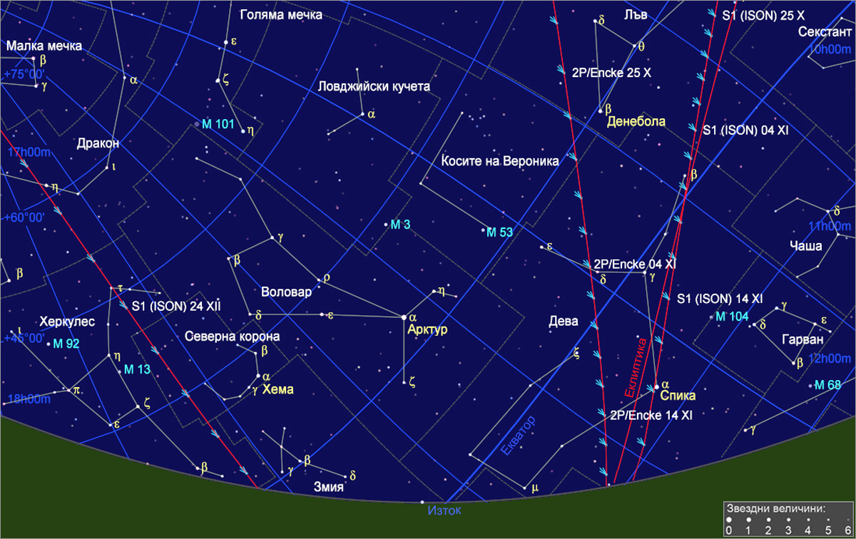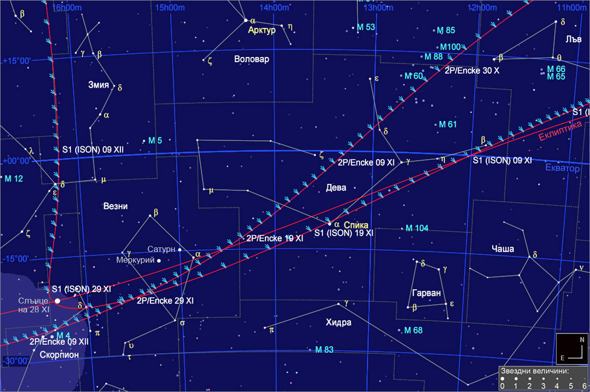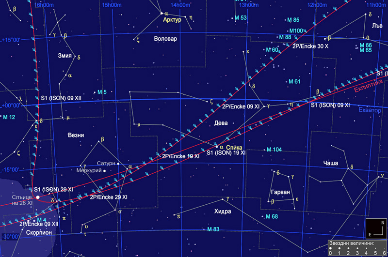 Подробна карта на източната част на небето на 22 ноември около 1h и 30m преди изгрева на Слънцето за наблюдател от България, с видимия път на кометата C/2012 S1 (ISON) от 25 октомври до 30 декември, както и на кометата 2P/Encke от 23 октомври до 18 ноември. Позициите на двете комети са указани със символи за утрата през две денонощия, а на всеки 10 денонощия са отбелязани име на кометата и дата. Кометите S1 (ISON) и 2P/Encke ще бъдат видимо най-близо преди изгрев слънце на 25 ноември, на ъглово отстояние около 1.5о, но тогава по-слабата 2P/Encke няма да може да се наблюдава поради сиянието на зората. Последен шанс да видим двете комети заедно ще има в утрата на 22 и евентуално – на 23 ноември, около 1h и 10m преди изгрева на Слънцето (около 06h 18m за София), но само при много добри метеорологични условия и при нисък хоризонт в посока югоизток. На 22 ноември преди изгрева S1 (ISON) и 2P/Encke ще бъдат на ъглово отстояние 5о и 20’, а на 23 ноември сутринта – на 3о и 35’.