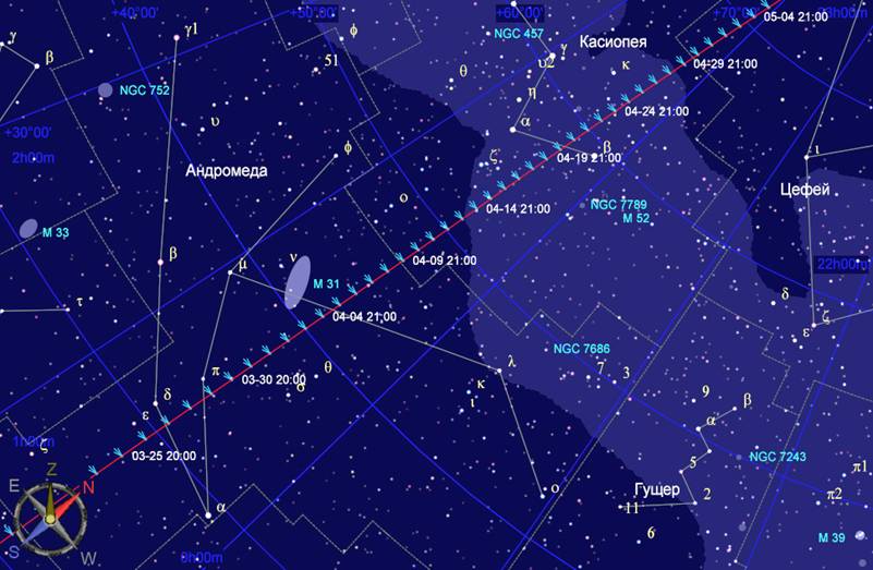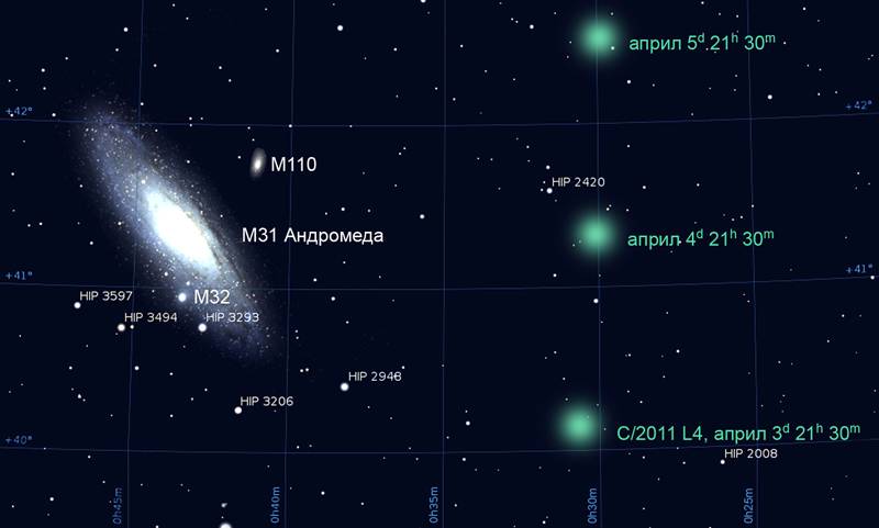 Видимото преминаване на C/2011 L4 покрай галактиката M31 Андромеда в началото на април