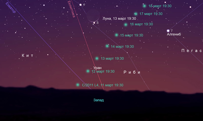 Кометата C/2011 L4 за наблюдател от нашата страна от 11 до 18 март около 1 час след залеза на Слънцето