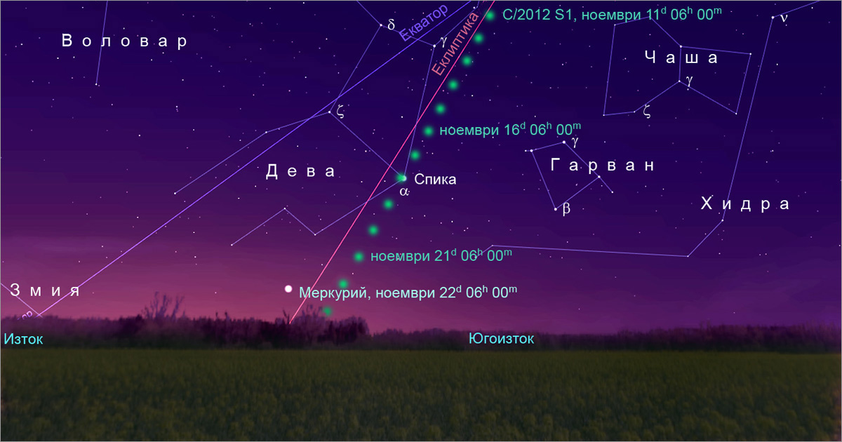 Югоизточната част на небето на 22 ноември около 1h и 15m преди изгрева на Слънцето за наблюдател от България, с видимия път на кометата C/2012 S1 (ISON) от 11 до 23 ноември.(моментите са в официално време)