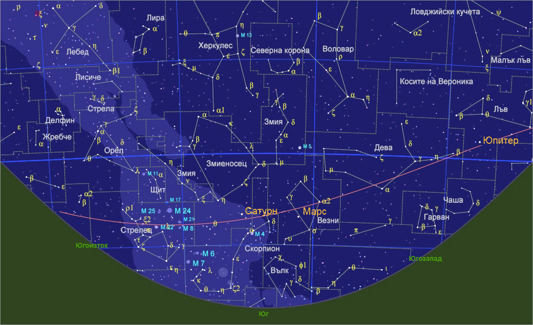 Условията за наблюдение на ярките планети продължават да бъдат добри. В началото на тези нощи ниско на югозапад е добре видим Юпитер – в съзвездието Лъв. Около полунощ над южния хоризонт най-удобно се наблюдават Марс – в съзвездието Везни и Сатурн – в съзвездието Змиеносец. От около средата на юли отново ще започне да се наблюдава Венера, но вече като Вечерница. На 28 август вечерта ще бъдем свидетели на атрактивно съединение на Венера с Юпитер. Двете ярки планети ще бъдат на около 6′ една от друга. Явлението ще се наблюдава до около един час след залез слънце, много ниско над западния хоризонт.