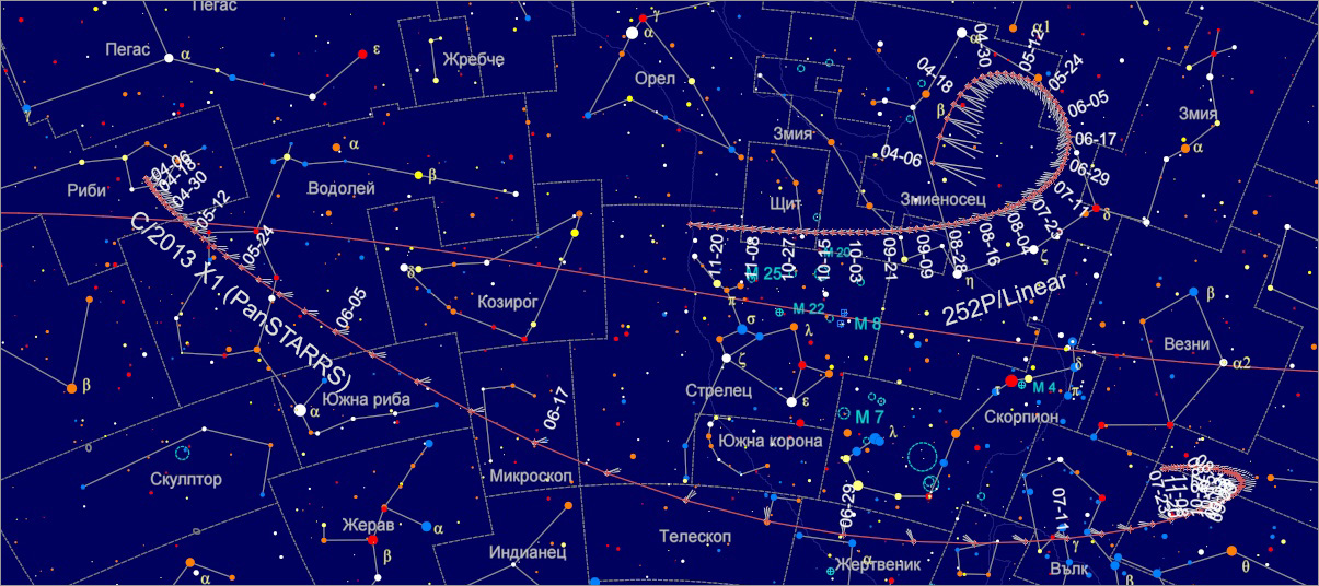 Можете да разгледате и карта на видимите пътища на кометите 252P/Linear и C/2013 X1 (PanSTARRS), Втората комета ще се наблюдава към края на нощите през май и юни, ниско над югоизточния хоризонт.