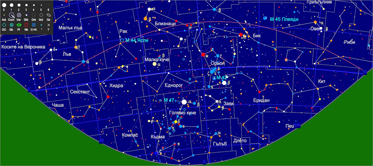 В началото на първите мартенски нощи на около 55° над югоизточния хоризонт с бинокъл можем да наблюдаваме красивият разсеян звезден куп M44, наричан „Яслите“ или „Кошерът“ в съзвездието Рак (Beehive Cluster, NGC 2632). Яркостта на купа е 3.7 mag, а видимият му диаметър е 95 дъгови минути, поради което в ясни и безлунни нощи можем да го забележим с невъоръжено око, ако сме далеч от градските светлини. Купът „Ясли“ е бил известен още в древността. Астрономът Хипарх (II в. пр. н. е.) е отбелязал този обект в своя звезден каталог като „мъглява звезда“. Клавдий Птолемей (II в. от н. е.) го описва в своя „Алмагест“ като една от 7-те мъглявини (видими с невъоръжено око). Една гръцка легенда свързва купа с двете видимо най-близки звезди от съзвездието Рак, наричани „Магаренцата“ – Asellus Borealis (γ Cnc) и Asellus Australis (δ Cnc). Ако посочите изображението с мишката ще видите техните означения. Разстоянието до купа е около 577 светлинни години, а предвид видимите му размери, реалният му диаметър в космическото пространство е близо 16 светлинни години.