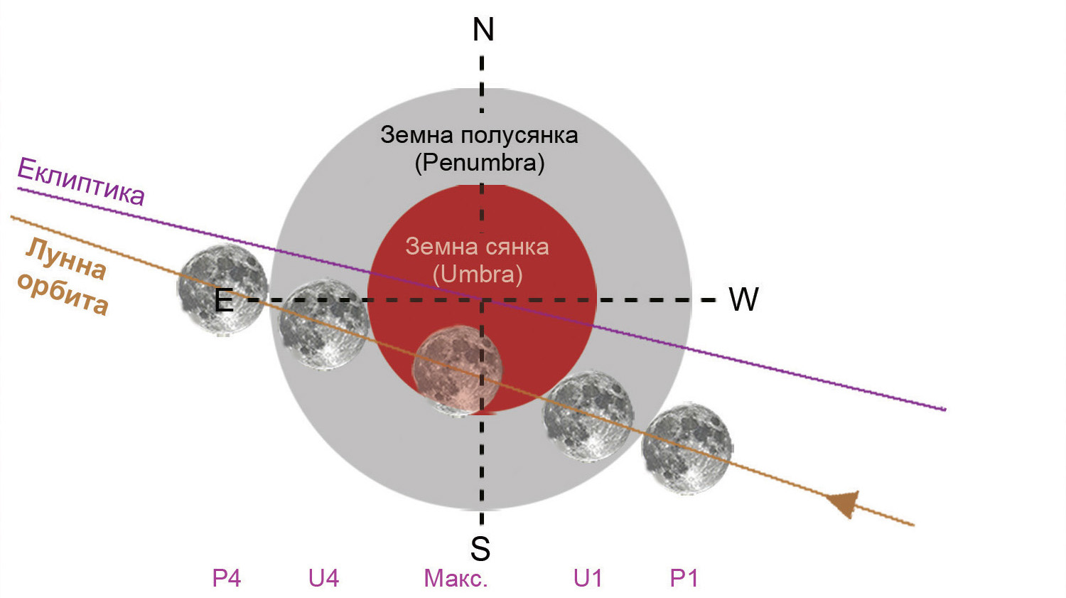 В началото на затъмнението от земната полусянка в 03:41 ч. българско време Луната ще бъде видима в посока югозапад-запад. Тогава все още няма да се забелязва разлика от обичайния вид на пълната Луна. Яркостта на горната дясна част на лунния диск ще започне да спада по-осезаемо с наближаването на първия контакт със земната сянка в 05:13 ч. (контакт U1 в картата по-долу) Тогава за наблюдател от София Луната ще бъде на височина 20° над хоризонта, а за Варна – на 17°. Максималната фаза ще настъпи в 05:44 ч. и логично тогава земната сянка, покриваща северната част на лунния диск, ще бъде най-добре забележима. Затъмнението от сянката ще завърши в 06:16 ч. (контакт U4), а Луната ще залезе в 06:58 ч. за Варна и в 07:17 ч. за София. Това означава, че ще можем да проследим докрай най-интересната част от явлението, макар че краят на затъмнението от сянката ще се наблюдава във вече настъпилия сутрешен полумрак.