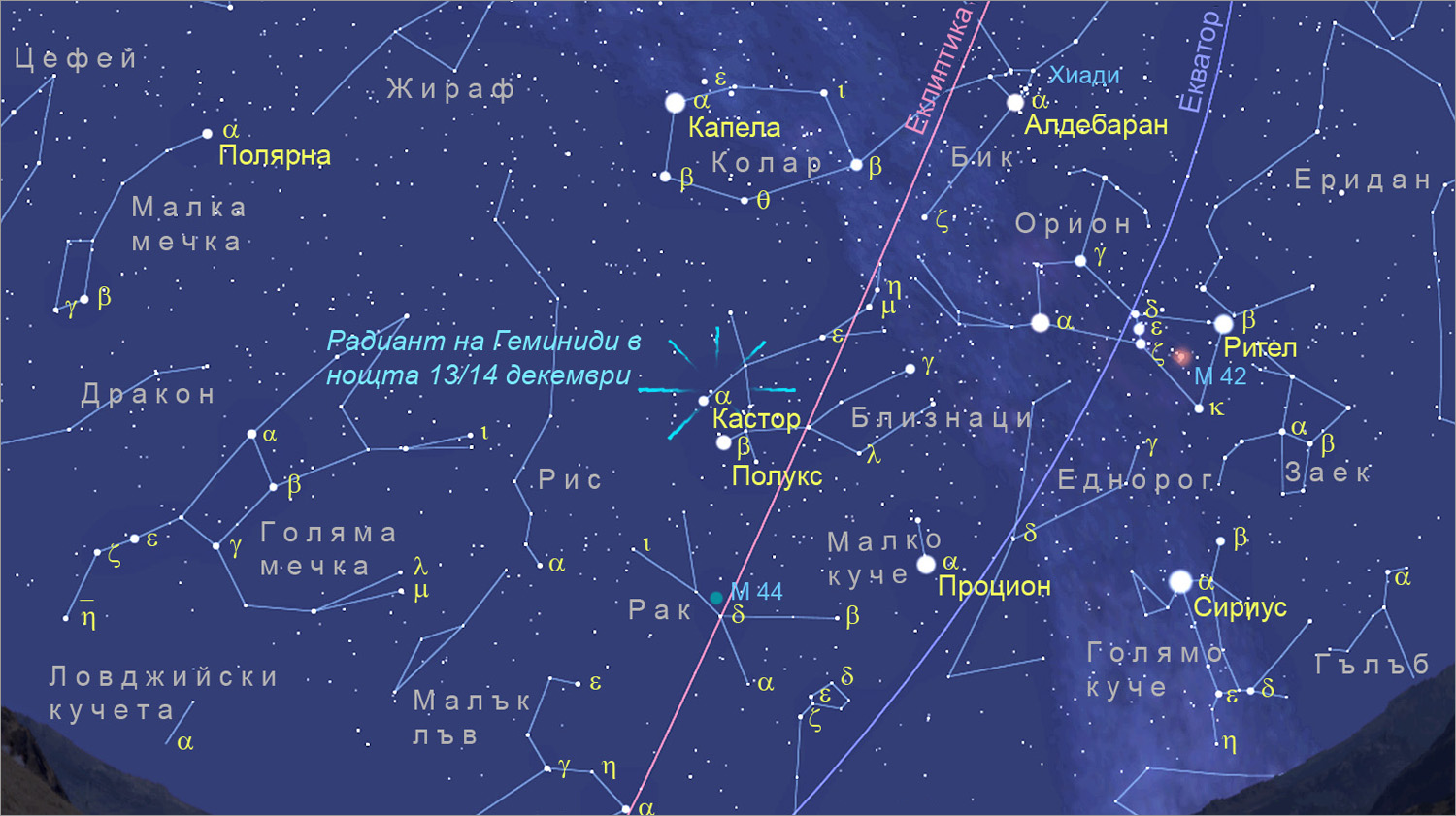Максимумът на метеорния поток Геминиди тази година ще бъде на 14 декември около 14:30 ч. българско време – т.е. през деня за нас. Това означава, че най-подходящото време за наблюдение от България ще бъде втората половина на нощта 13 срещу 14 декември и през следващата нощ – 14 срещу 15 декември. Луната ще бъде във фаза малко преди първа четвърт и ще залязва малко преди полунощ.