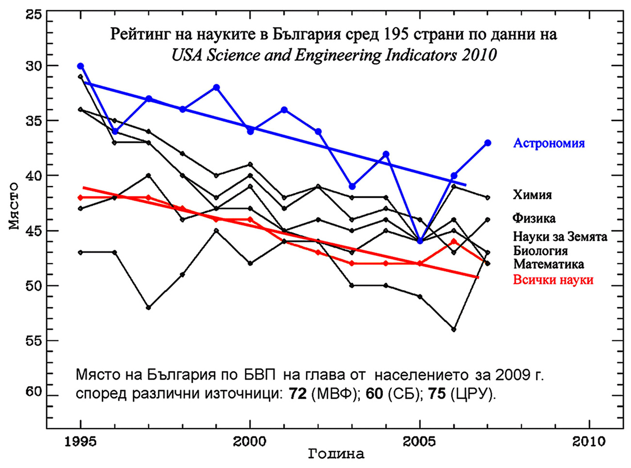 През 2010 година бе публикуван деветнадесетия доклад за развитието на науката в САЩ и в света. Обобщена информация за съдържанието на доклада се съдържа в писмото на Председателя на борда за научни изследвания, с което той изпраща доклада на Президента и на Конгреса на САЩ. Такива доклади се подготвят и представят на всеки две години. Анализът за периода от 1995 до 2007 година съдържа информация за развитието на различни области на науката и инженерните дисциплини в 195 държави. Целият доклад с Приложенията, от които са взети данните, се намира на сайта http://www.nsf.gov/nsb. Част от данните за България са показани в приложената по-долу графика. По хоризонталната ос е нанесено времето, а вертикалната ос показва на кое място е класирана България сред разгледаните 195 страни. Тази графика е доста показателна в няколко отношения. Първо, добре се вижда тенденцията за спад в рейтинга на България. За разглеждания дванадесетгодишен период, отчитайки средно всички области на науката, България се е преместила от 41-ва на 49-а позиция. Второ, почти през целия период най-високо в класацията сред другите науки се намира астрономията. И трето, интересно е сравнението на мястото на България в тази класация с позицията, която страната заема по брутен вътрешен продукт на глава от населението.
