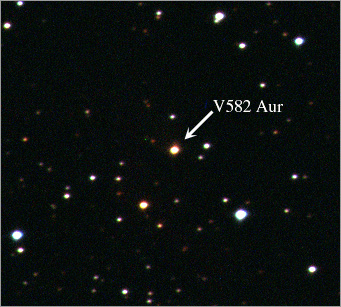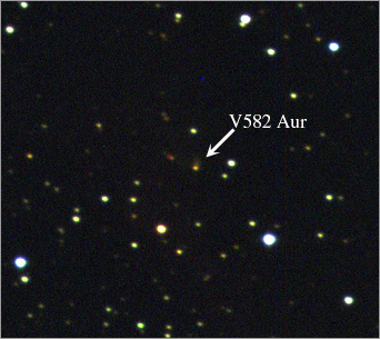 Звездата е открита като променлива от руския астроном-любител Антон Хруслов през 2009 г. и носи означението V582 Aur. Според данните от фотографските астрономически архиви, които събрахме до момента, звездата е избухнала през 1984 г. и досега остава със силно повишен блясък. Нашите фотометрични наблюдения на V582 Aur започнаха от есента на 2009 г. с използването главно на телескопите на НАО Рожен. Същевременно по наша инициатива и с наше участие бяха получени спектрални наблюдения в обсерваториите Горен Прованс (Франция), Азиаго (Италия) и Скинакас (Гърция).