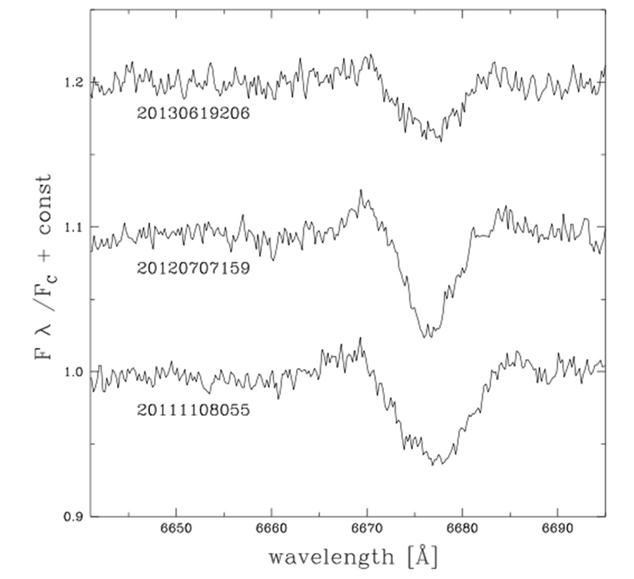 Спектралните наблюдения покриват периода от ноември 2011 г. до юли 2013 г. В рамките на орбиталният период, линията ще осцилира около средно положение и ще бъде отместена или към синята, или към червената област на спектъра спрямо лабораторната дължина.