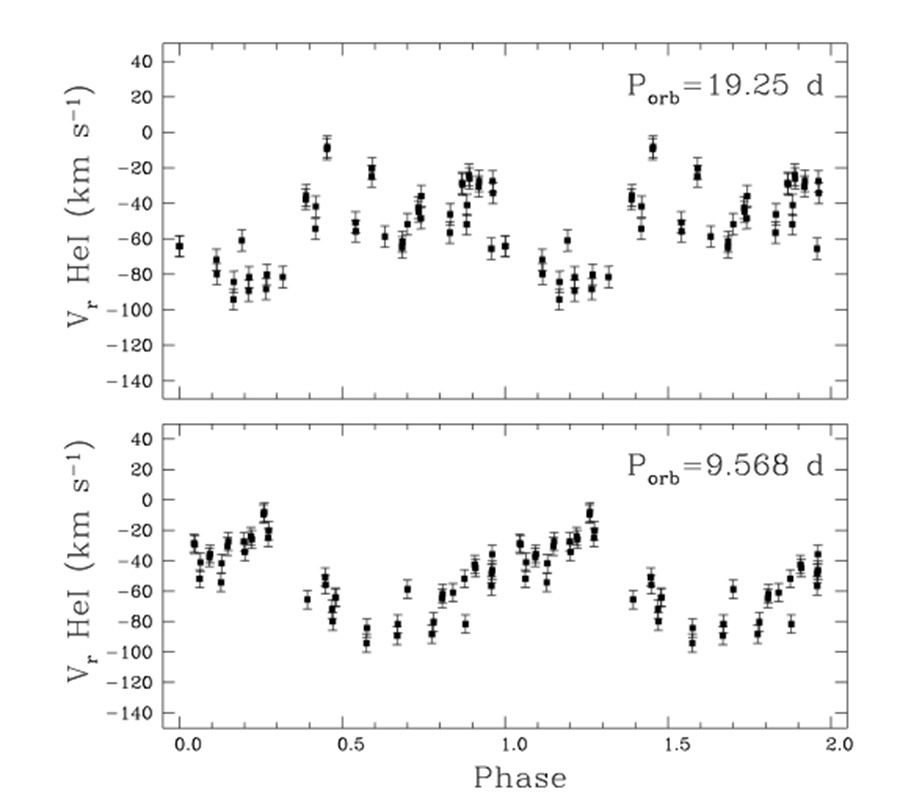 Фиг.2 Фазови криви на радиалнатa скорост при двата орбитални периода съответно – 19.25 и 9.568 денонощия.