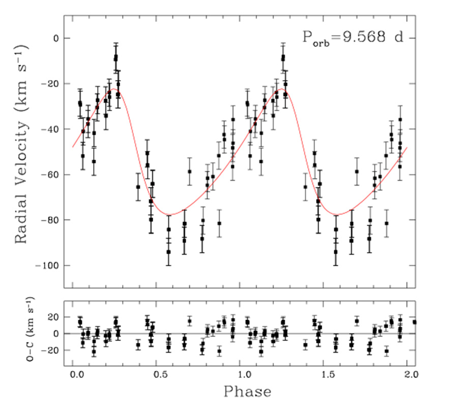 Фиг.3 Орбиталното решение за 4U 2206+54. Червената крива фитира фазовия профил на радиалната скорост при период от 9.568 денонощия.