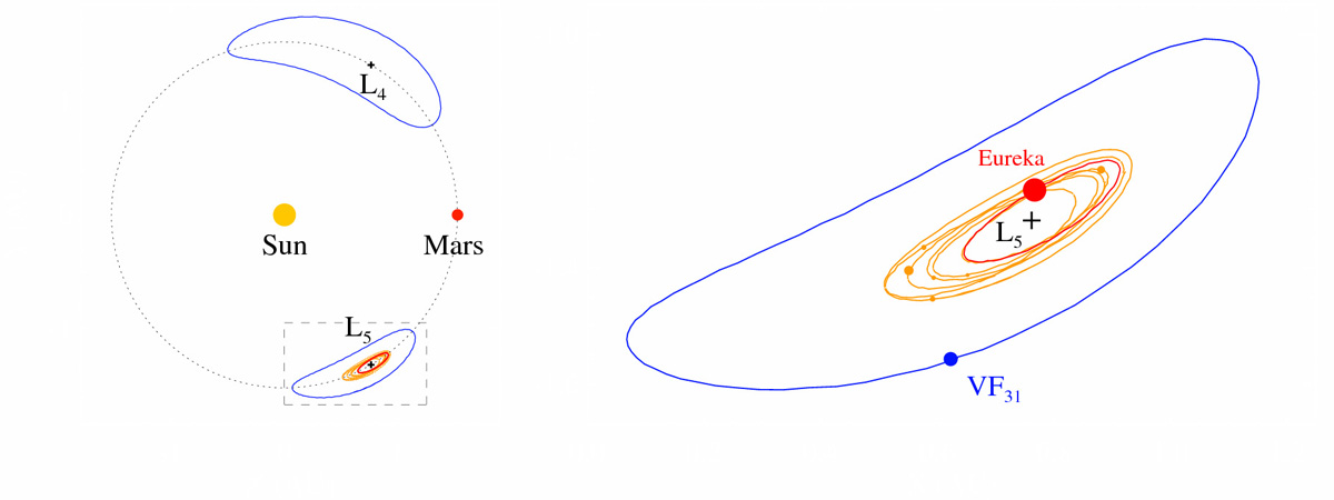 Дясно: увеличение на частта отбелязана с пунктиран правоъгълник, показваща пътя на осемте L5 троянци: 1998 VF31 (означени като "VF31" – в синьо), Eureka (в червено) и 6-те обекта, определени като членове на семейството ѝ (кехлибар). Плътните дискове показват относителните размери на астероидите. Eureka, най-голямият член, е около 2 km в диаметър.