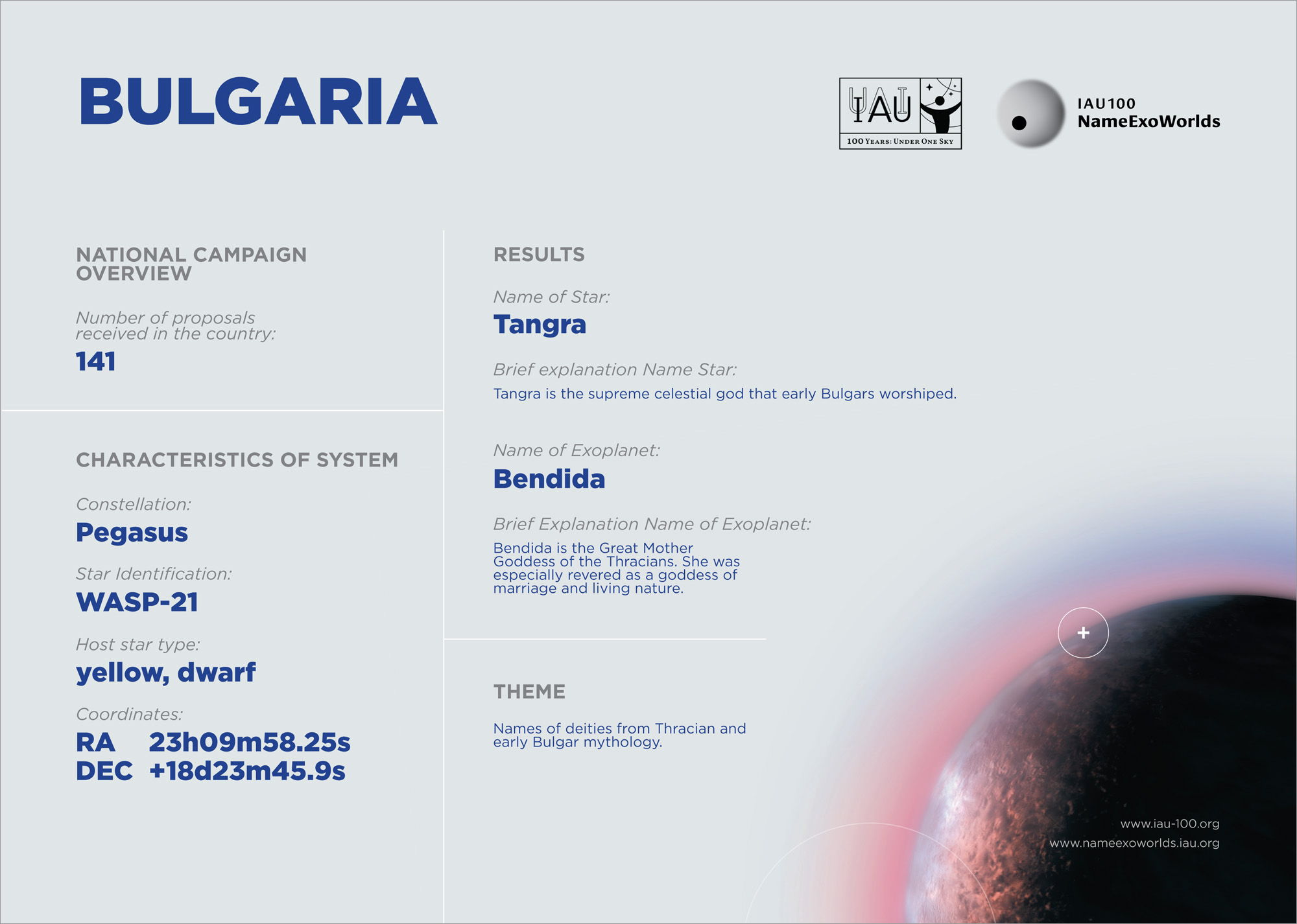 Екзопланетната система, определена за България, е WASP-21, разположена в съзвездието Пегас на разстояние около 850 светлинни години от Земята. Звездата е жълто джудже с размери и маса, много близки до тези на Слънцето. Планетата е от типа на газовите гиганти – подобна на Юпитер, но с около три пъти по-малка маса, и е разположена много по-близо до звездата си, отколкото Меркурий е отдалечен от Слънцето. Цялостната кампания „Дайте име на екзосвят“ у нас – разпространяване на информацията, организиране на даване на предложения, избор на имена – беше организирана от специално подбран Национален комитет съгласно правилата на МАС.